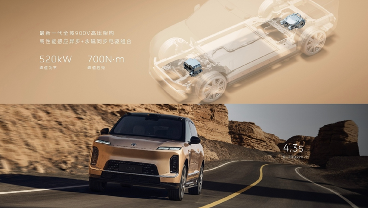 动力方面,蔚来ES9采用最新一代全域900V高压架构,采用高性能感应异步+永磁同步电机,综合功率520千瓦,综合扭矩700牛·米,百公里加速仅需4.3秒。搭载自研高性能六活塞制动卡钳,100-0km/h制动距离仅需35.3米。电池方面蔚来ES9搭载来自宁德时代的102kWh电池组,纯电续航里程分别为620km、600km、580km。此外,新车还搭载AQUILA天鹰座超感系统、天行全主动悬架系统、天行线控转向等。