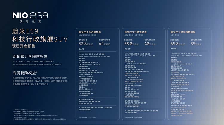 蔚来汽车举行ES9产品技术发布会,ES9实车正式亮相并开启预售,整车购买预售价区间52.8-65.8万元;电池租用方式购买预售价区间为42-55万元。据悉, 蔚来ES9(参数|询价)将于5月底正式上市,中岛座椅布局车型将于5月底开启交付,通道座椅布局车型将于7月底开启交付。