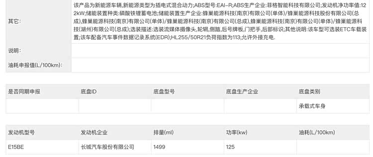 动力方面,从工信部信息来看,新车将提供1.5T和2.0T发动机,最大功率分别为125kW和175kW;电池方面,新车将提供42.8kWh和64.7kWh两种容量选择。