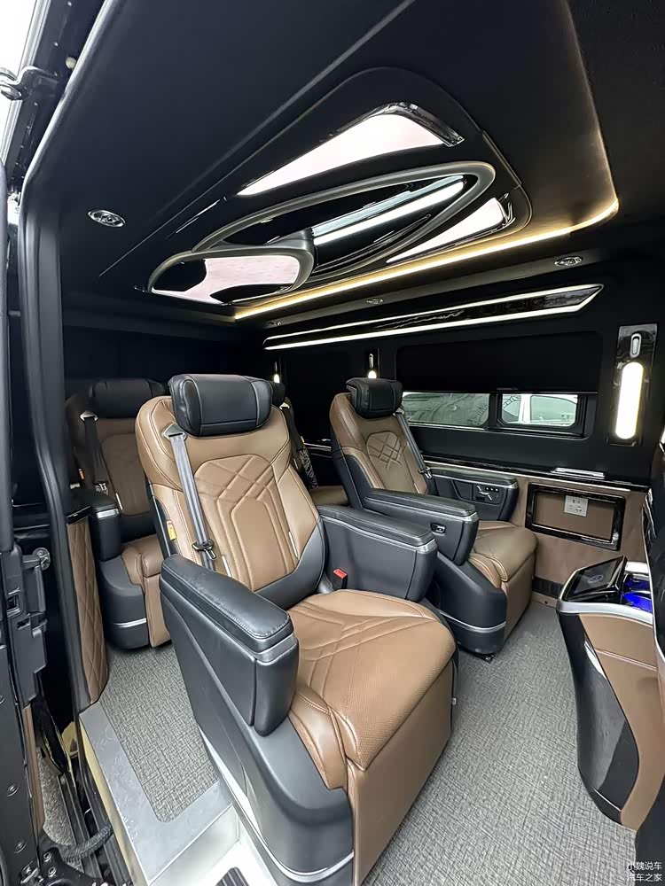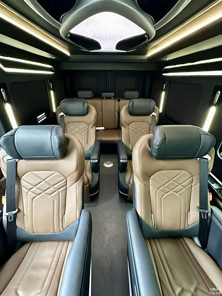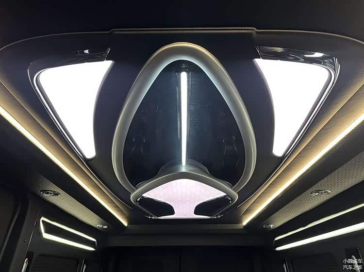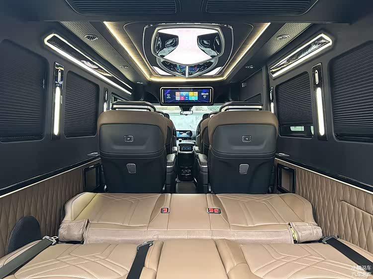 第二排搭载两张头层纳帕真皮航空座椅,支持通风、加热、多模式按摩和电动腿托调节,还能实现180度向后旋转,无论是商务接待时与后排客户对坐洽谈,还是家庭出行时与孩子互动,都能轻松实现。最后一排则是一个三连排的沙发床,可以180度的进行放平平躺,累了困了都可以在车里休息。整个车子的顶部也是单独定制的,一个超好看的顶灯搭配着氛围灯,墙壁上都各自配备了独立的壁灯。车内标配了百褶的窗帘,进入到车里面整体来看还是相当的豪华的。