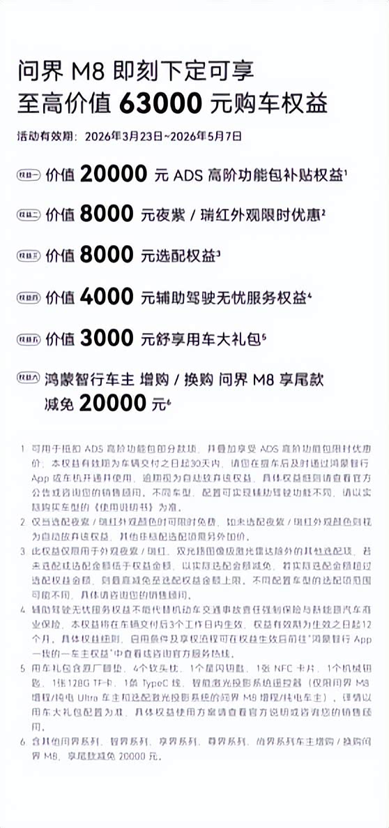 作为上市不到一年就累计交付突破16万台的40万级销量标杆,此次焕新进一步强化了问界M8的核心竞争力,无论是超强的智能感知守护,还是长续航版本的全面补位,都精准契合高端家庭用户的出行需求。为回馈用户,此次焕新上市同步推出限时购车权益,5月7日之前下定即可享受至高价值63000元购车权益,涵盖价值20000元ADS高阶功能包补贴权益、价值8000元夜紫/瑞红外观限时优惠、价值8000元选配权益、价值4000元辅助驾驶无忧服务权益,以及价值3000元舒享用车大礼包等多重福利。