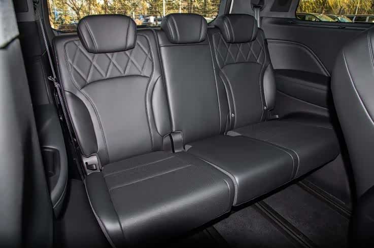 魏牌高山8在第三排的处理上比较有特色,其采用了特殊的“阶梯式”座椅布局,第三排座椅的位置比第二排略高,且坐垫经过加长加厚处理,这种设计带来了两个显著优势。首先,后排乘客的视野变得更好,第三排乘客不会觉得像是被关在小黑屋里面一样;其次,坐垫对大腿承托更充分,坐姿更接近正常的椅子,而非小板凳蹲坐。结合我们实测的静态表现来看,身高1米75的成年男性将二排座椅调节到舒适坐姿后,切换到第三排进行乘坐,膝部仍有一拳以上的余量。当然,高山8也不是完美的,由于第三排座椅较高,导致整车重心偏高,且满载7人时,后备箱的垂直高度也会受到一定影响。