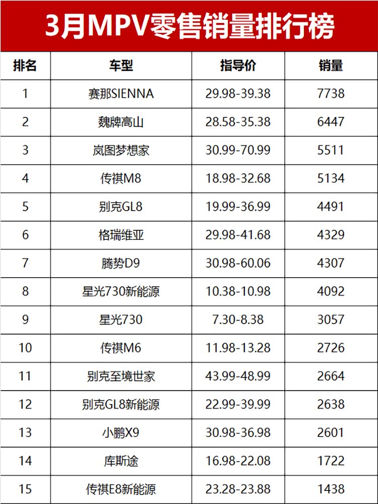 先看榜首,没啥悬念,丰田赛那SIENNA还是稳坐第一,3月卖了7738辆,妥妥的家用MPV“常青树”。说实话,赛那能一直霸榜,也确实有道理,产品力扎实,口碑也在线,家里人多、想选台省心的MPV,很多人第一反应就是它。