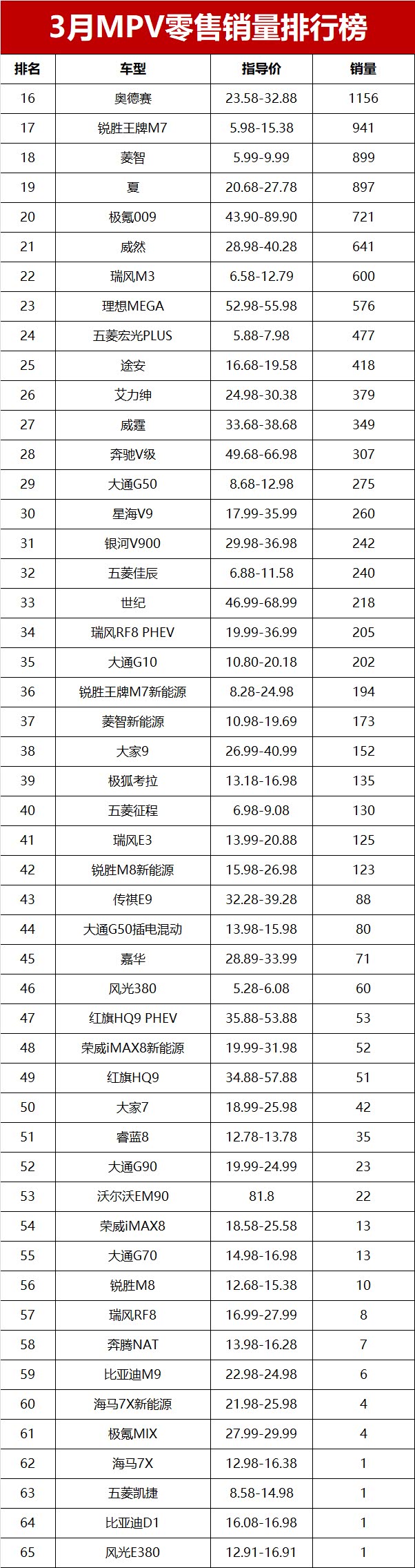 最后总结一下,3月MPV市场就是“高端卷疯了、中端稳中有降、低端有惊喜”。自主高端MPV越来越强,不断抢合资的地盘,新能源MPV也成了竞争核心,但不同车型的差距越来越大。听说腾势D9新款要上市了,说不定后续销量榜还会有大变动,咱们接着往下看!