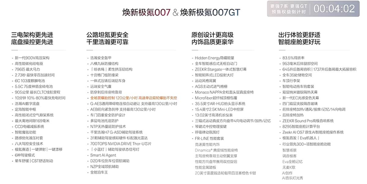 两款新车均标配全景天幕,紫外线阻隔率99.99%,能有效隔绝紫外线,提升车内舒适性。座椅支持14向电动调节,前排配备加热、通风、按摩和记忆功能,后排配备加热功能,无论是前排驾驶还是后排乘坐,都能获得不错的体验。后备厢空间方面,新款极氪007容积为642L,007GT为645L,放倒后排后,007GT的后备厢容积可拓展至1737L,两款车型的后备厢都设有下沉空间,能存放更多物品。007GT还额外提供车顶行李架、智能电动拖车钩套装和雪橇洞,标配220V电源,兼顾了多场景使用需求。音响系统方面,两款新车均配备ZEEKR Sound Pro音响,23扬声器搭配2160W功率和7.1.4杜比全景声,能带来不错的听觉体验。