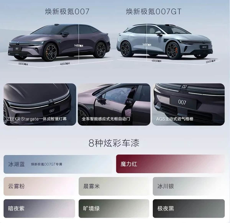 新款极氪007与007GT采用了统一的前脸设计,新款007向现款007GT的风格靠拢,整体视觉更具整体性。前脸配备ZEEKR Stargate一体式智慧灯幕,搭配辅助驾驶小蓝灯,辨识度不低。前包围的主动式进气格栅是个实用设计,能随温度和车速智能开闭,起到降低风阻的作用,两侧的导流槽也进一步优化了空气动力学表现。车身尺寸上,两款新车保持一致,长宽高为4858/1900/1450mm,轴距2925mm,相比现款极氪007,车长和轴距分别减小7mm和3mm,变化不算明显。隐藏式门把手和四活塞定钳的配备,兼顾了美观与性能。尾部的贯穿式尾灯和动感扰流板提升了运动气息,其中007GT配备双层扰流板,更具辨识度。颜色选择上,新款007新增5种外观颜色,共提供7款选择,007GT新增2种颜色,共8款,能满足不同用户的个性化需求。