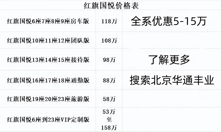 【 红旗国悦(参数|询价)4S店-华通丰业汽车 红旗国悦中国总店】价格6-9座房车版70万到118万,10座到12座豪华版68万到148万,13座到17座接待版45.6万到78万,18座到23座45.6万到64万,外观颜色可选山岩棕,日光金,至臻黑,天际灰,内饰支持个性化定制,红旗国悦总部提供五年十二万公里超长改装质保,全国送车上门,当天开票手续齐全,工厂直营店,购车无忧!