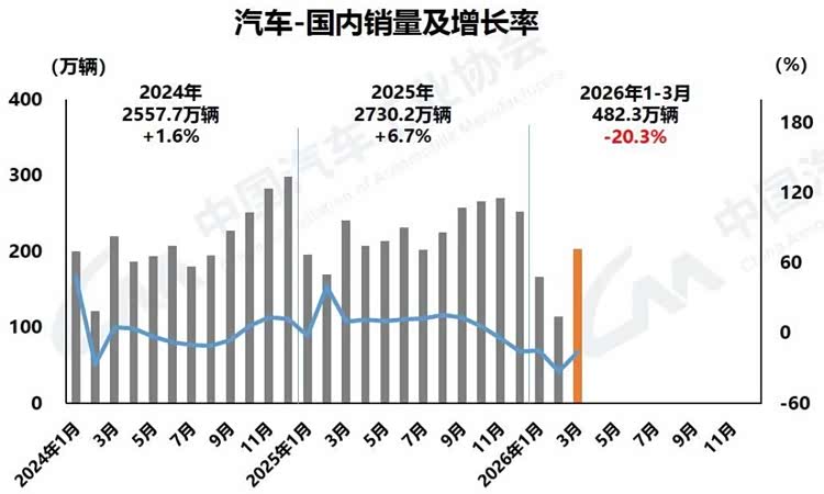 一季度国内汽车销量482.3万辆,同比下降20.3%,这意味着在2026年的前三个月,中国车市这个全球最大的单一市场,每天比去年少卖了近9000台车。