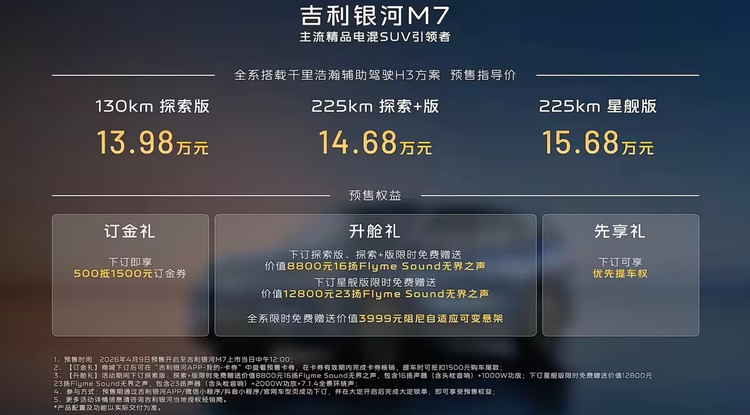 4月9日,吉利 银河M7(参数|询价)正式开启预售,共推出3款车型,预售价区间为13.98万至15.68万元。新车定位紧凑型SUV,基于GEA Evo架构打造,搭载1.5L插电式混合动力系统,并配备神盾金砖电池,CLTC纯电续航里程达225公里,综合续航里程可达1730公里。