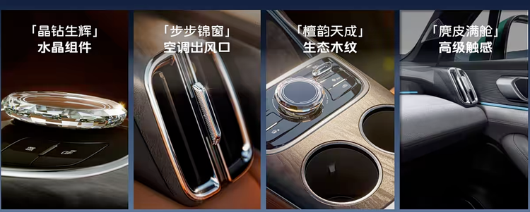 车身侧面线条流畅动感,前后侧翼子板搭配宽厚轮眉及大尺寸密条辐轮圈,提供18、19、20英寸三种规格。车身尺寸为4770/1905/1685毫米,轴距2785毫米。车尾配备车顶扰流板(内置高位刹车灯),超2米长的星汉涟漪贯穿灯(含362颗灯珠及500多个激光蚀刻),以及旭日东升尾灯(344颗超红光LED),后包围采用双段式扩散器装饰与贯穿式镀铬饰条。内饰方面,提供观山灰、栖霞橙、观山灰(麂皮)、静湖白四种主题。