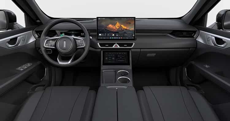 新摩卡Hi4 Max版在外观上彻底和“中庸”二字划清界限。四驱黑武士专属的暮夜黑车漆,配合黑色外观亮条与黑色行李架,整体视觉效果干净利落,既有工业设计的冷峻感,又透着一股不怒自威的运动气息。座舱内部同样延续黑化主题,从顶棚、立柱到遮阳板一律暗色处理,坐进去的瞬间,那种被高级感包裹的氛围比照片来得更直接。