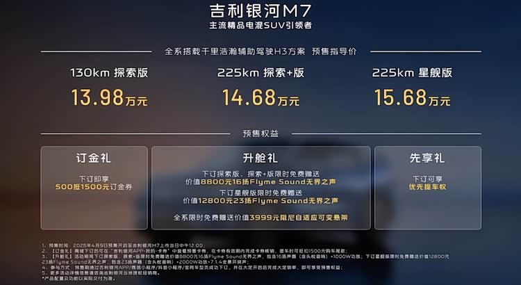 在新能源家用车市场,能耗表现与座舱质感直接决定用车幸福感,吉利银河M7聚焦用户高频使用场景,以高效节能与精致座舱两大核心优势,为15万级电混SUV带来全新体验。吉利银河M7本次推出三款版型,预售价格区间为13.98万元至15.68万元,用户下订可享受500元抵1500元订金礼,探索版与探索+版可免费升级16扬音响系统,星舰版可获赠23扬高规格音响,全系免费升级阻尼自适应可变悬架,同时享有优先提车权,大幅提升购车性价比。银河M7以务实定价与贴心权益,成为家用出行的高价值之选。