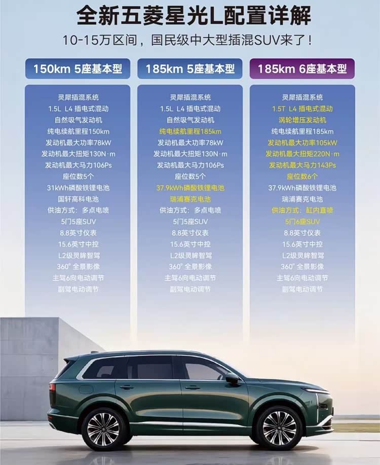 五菱星光L搭载1.5L插混和1.5T插混动力,其中1.5L发动机最大功率为78千瓦,最大扭矩130牛·米,电机功率暂未公布,将匹配容量为31千瓦时的磷酸铁锂电池,纯电续航里程150公里,1.5T发动机最大功率为105千瓦,最大扭矩为220牛·米,电机功率未知,匹配37.9千瓦时的磷酸铁锂电池,纯电续航里程185公里(以上市公布信息为准)。