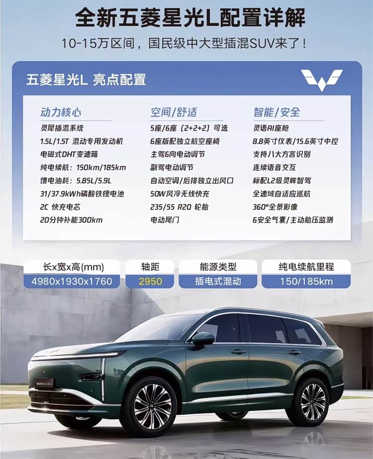 总的来说,五菱星光L的外观和内饰能够给我们带来新鲜感,至于好不好看?每个人的审美不同,给出的评价不一样,这款插混中大型SUV的拥有宽敞的空间和丰富的配置,1.5L/1.5T插混动力能够满足不同用户需求,那么你觉得五菱星光L定价多少会被大家认可呢?欢迎留言讨论。