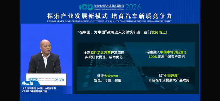今日全程观看了 EV100 智能电动汽车发展论坛直播,聆听了多位行业从业者对智能电动赛道发展趋势的交流与探讨。其中,大众汽车集团(中国)执行副总裁、CARIAD 中国首席执行官韩三楚的主题演讲,给我带来了极强的启发。这场分享清晰勾勒出了外资车企在华业务的转型逻辑,也让我对合资品牌阵营接下来的发展路径,有了更透彻的理解。