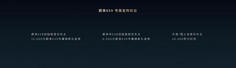自 2026年4月9日(含)起至正式上市发布前,预订蔚来ES9的用户,将享受限时预订权益,支付5,000元预订金,可抵扣10,000元购车款。蔚来还为老用户提供了ES9的专属复购礼遇:蔚来ES8创始版首任车主可享10,000元ES9专属焕新礼金券,蔚来非ES8创始版首任车主可享6,000元ES9专属焕新礼金券;乐道、萤火虫首任车主每人可享 2 万复购积分红包。