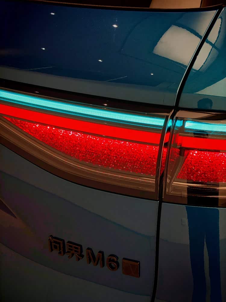 问界M6采用全新锋刃美学设计语言,封闭式车头搭配俯冲感线条,多边形大灯组融入星河光效,与单条幅LED灯带及前包围两侧风道融为一体,整体视觉更具攻击性。