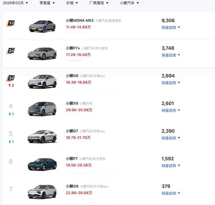 事实上也是如此,从刚刚发布的3月销量来看,MONA M03以9306台的数据在小鹏序列中一骑绝尘,而第二名小鹏P7+却只卖出了3784台,而去年底上市的小鹏P7和小鹏G7两款新车完全不给力,销量还不如最贵的小鹏X9。