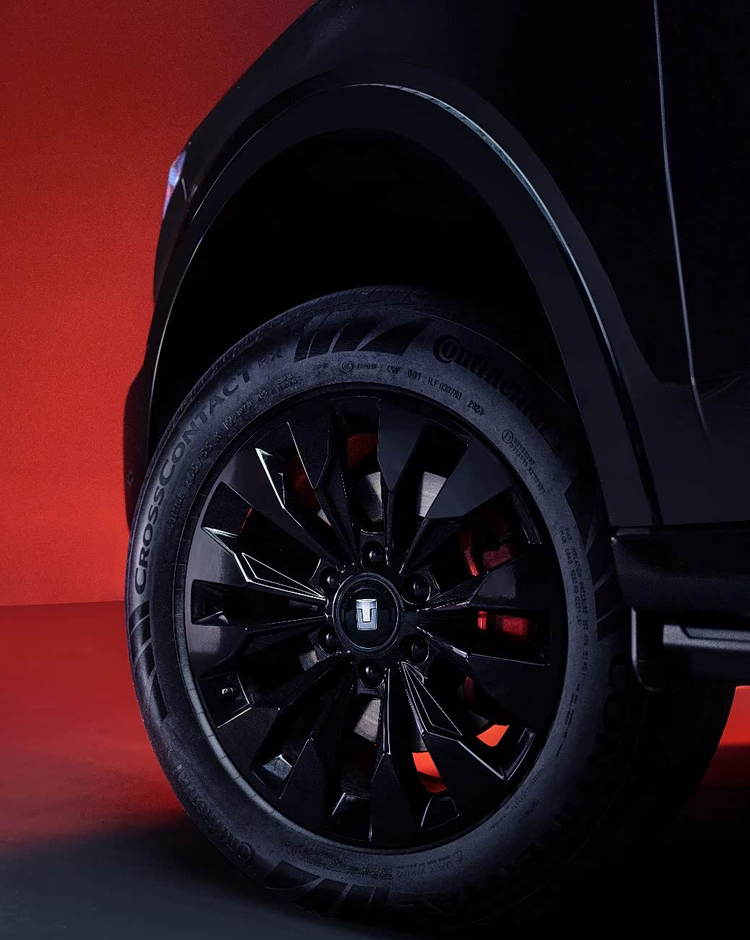 作为特别版车型,坦克500黑武士整体还是依托现款坦克500的基础造型打造,没有进行大刀阔斧的改动,重点调整都集中在细节部分,目的就是强化黑武士的专属气质。整车采用了全黑涂装,就连前格栅都选用了哑光黑色设计,没有多余的装饰,视觉上显得格外沉稳。除了格栅,车身的侧踏、行李架也都采用黑色处理,轮圈则是密辐式的亮黑款式,搭配红色的刹车卡钳,黑与红的碰撞不算张扬,却能很自然地营造出运动感,和普通版本相比,多了几分专属的精致感,也更符合黑武士的定位。这种全黑的设计思路,没有过度追求夸张,反而贴合了硬派越野的沉稳调性,日常通勤和户外越野都能hold住场面。