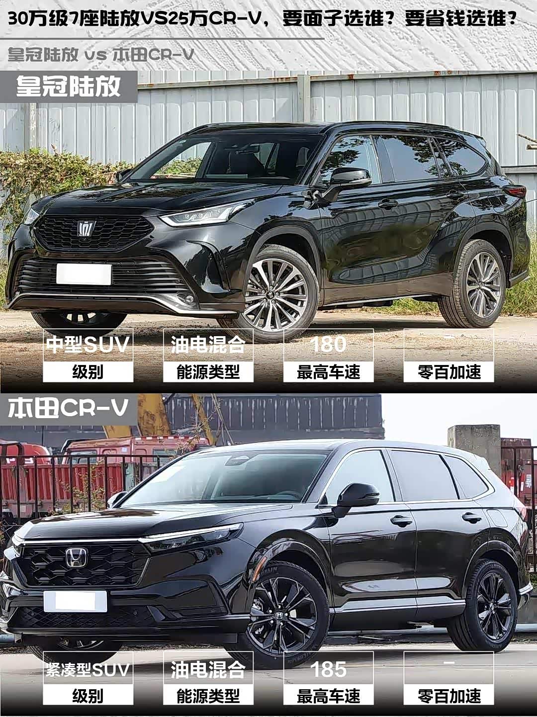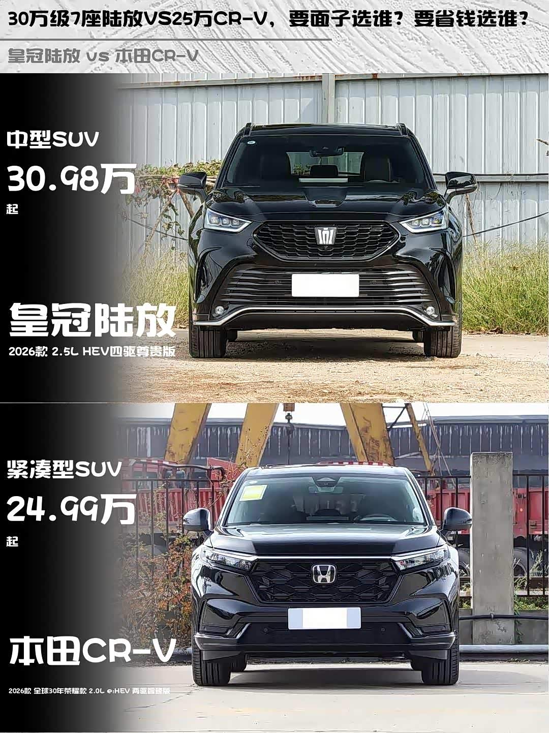 车家号·0浏览·2026-04-12 08:23 · 北京最近在选车的小伙伴看过来!👀 今天给大家深度对比两款热门混动SUV——皇冠陆放2026款2.5L HEV四驱尊贵版 vs 本田CR-V(参数|询价) 2026款全球30年荣耀款2.0L e:HEV两驱智臻版,实测干货奉上!🔥