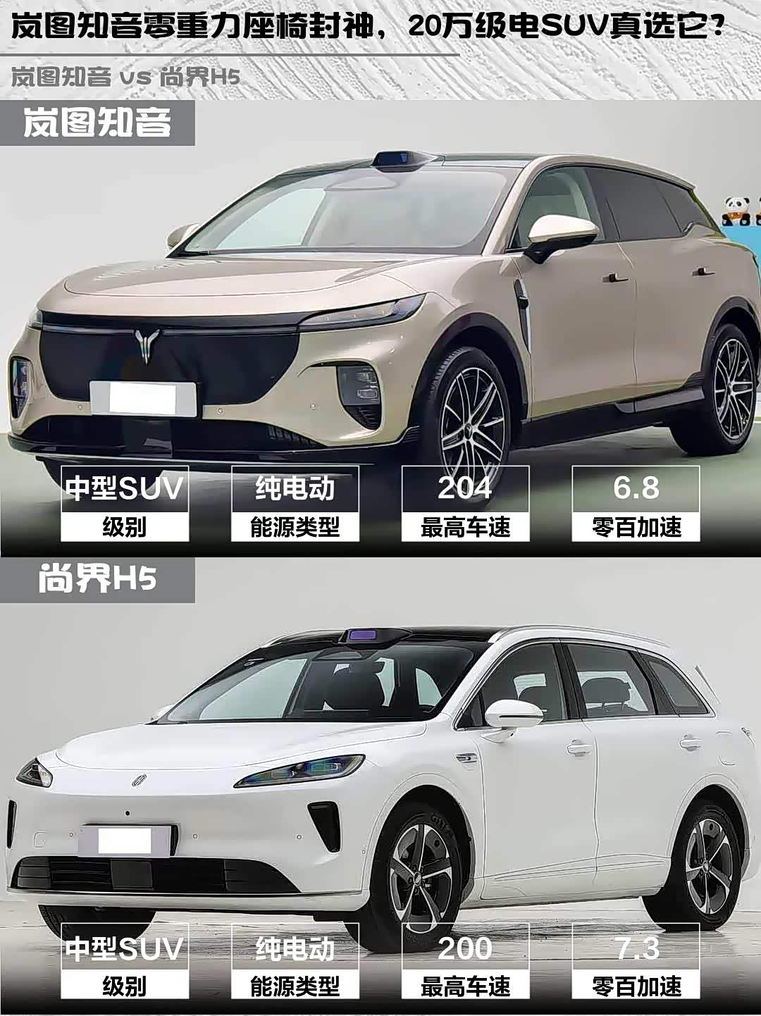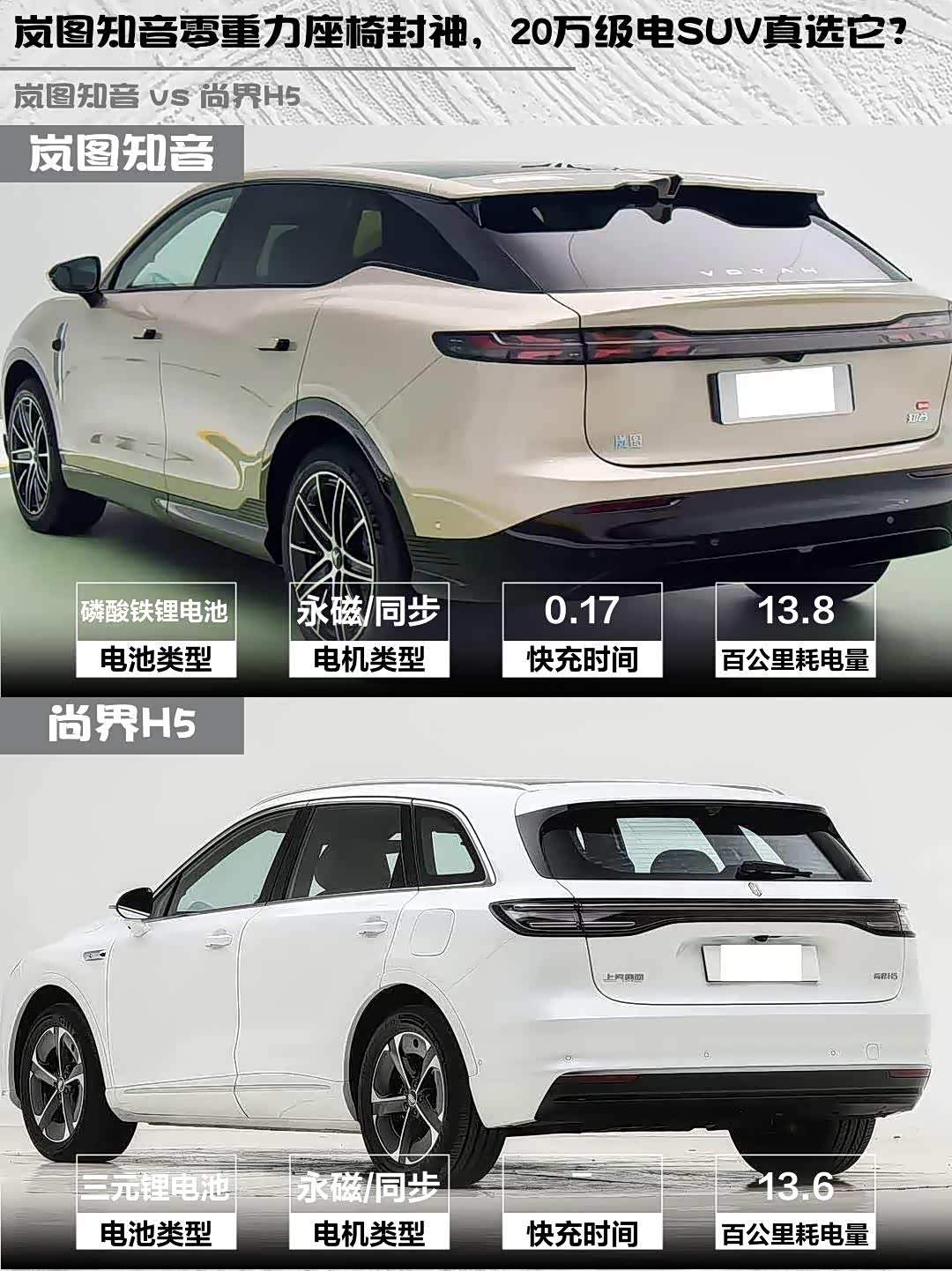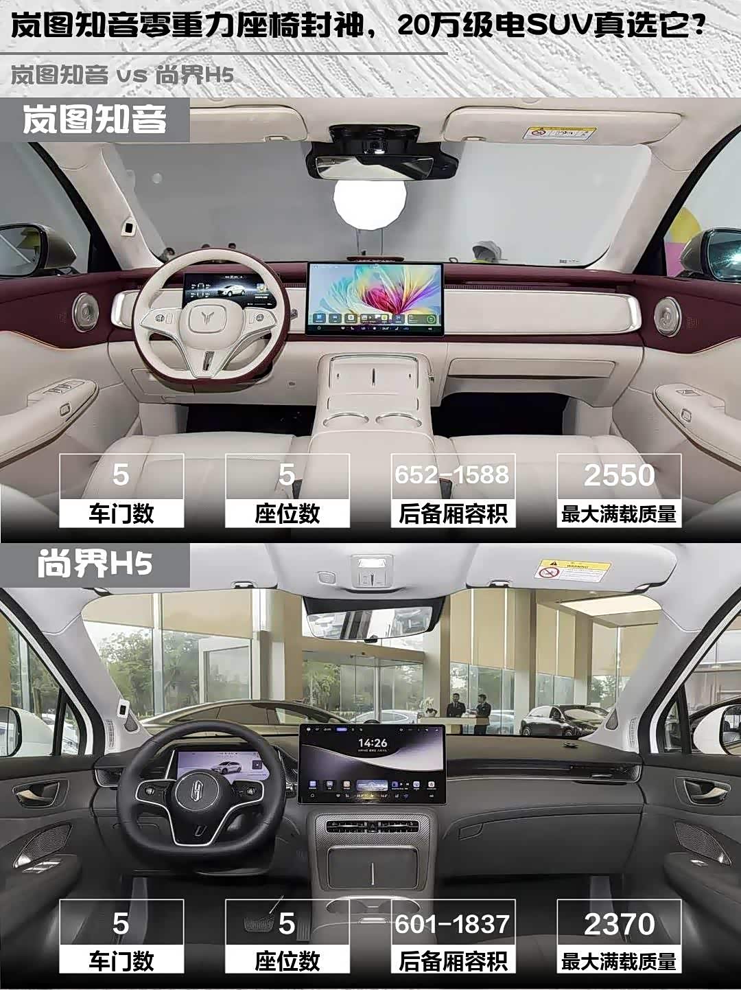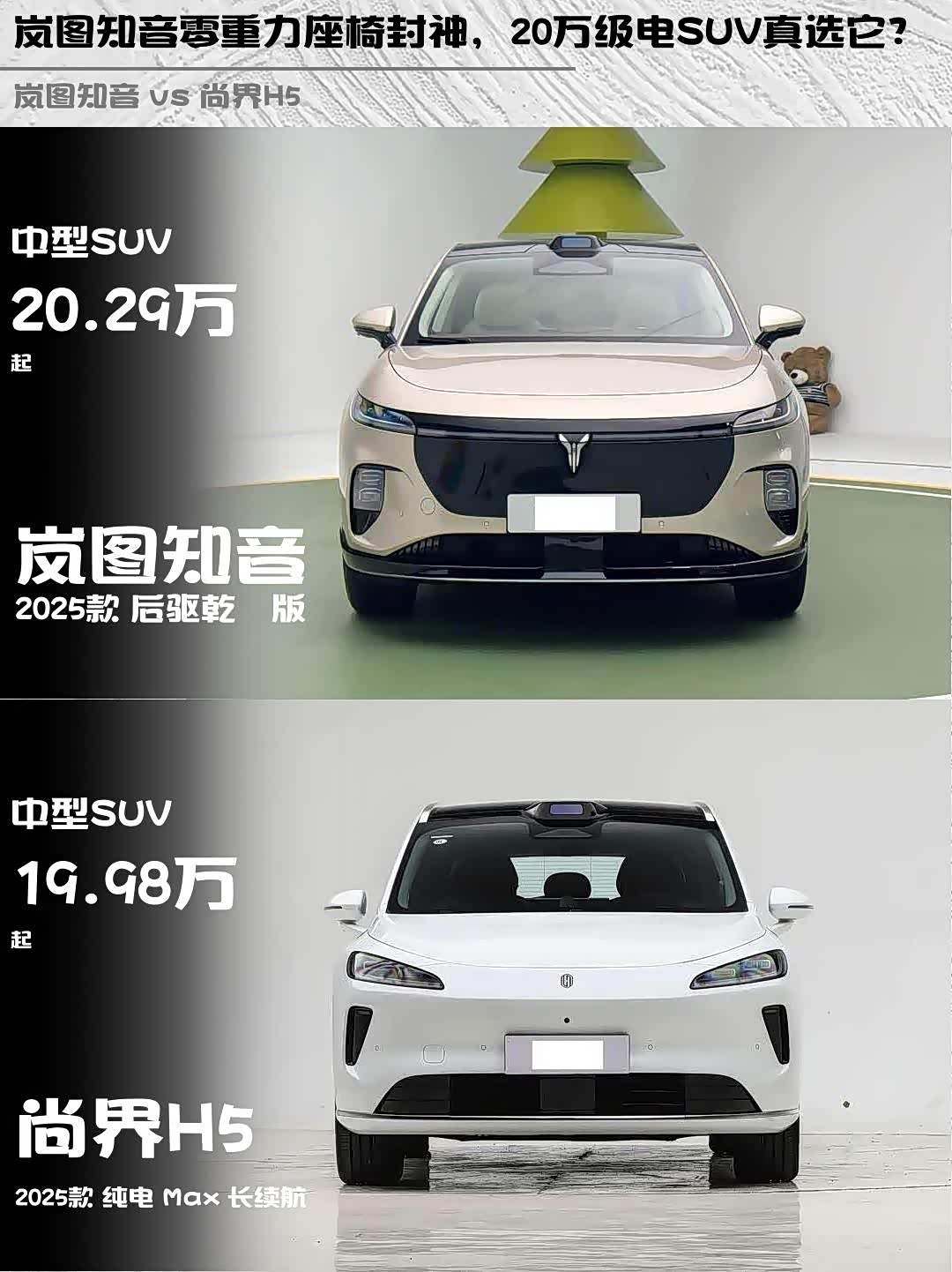 最近在20万级纯电SUV里纠结了好久,最终锁定 岚图知音(参数|询价)2025款后驱乾崑版和尚界H5 2025款纯电Max长续航这两款热门车型。深度试驾后,分享些真实感受给同样纠结的兄弟们!🚗💨