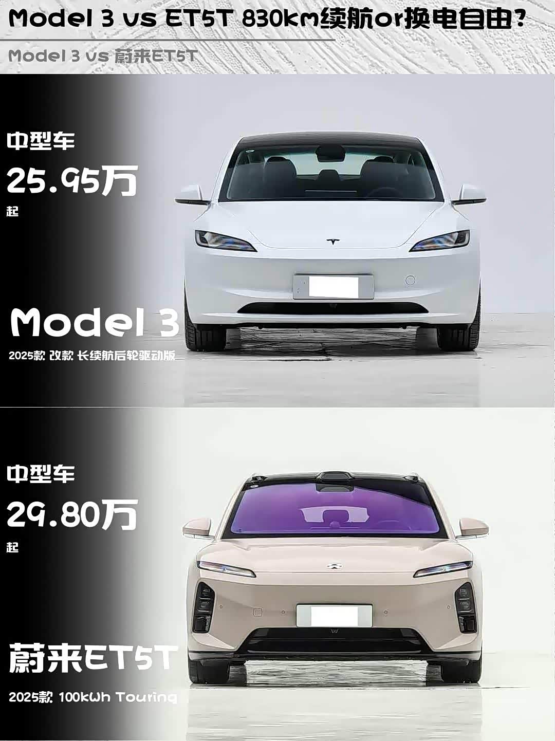 要极致驾驶乐趣+续航扎实,选25.95万的Model 3长续航;要颜值个性+换电便利,29.8万的ET5T更适合。偷偷说个彩蛋:现在ET5T停产在售,去店里砍价说不定有惊喜~