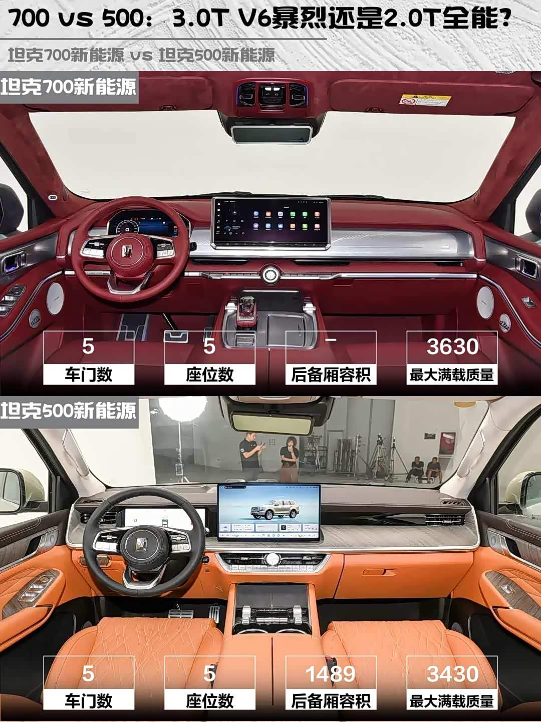 坦克700的3.0T V6+电机组合堪称暴力美学,560N·m扭矩+5.6秒破百,高原超车时发动机声浪简直让人上头!而坦克500的2.0T+电机更注重经济性,4.3秒加速虽然更快,但少了V6那种浑厚的底气。不过500的59.05kWh大电池纯电续航更持久,市区通勤基本不用油。