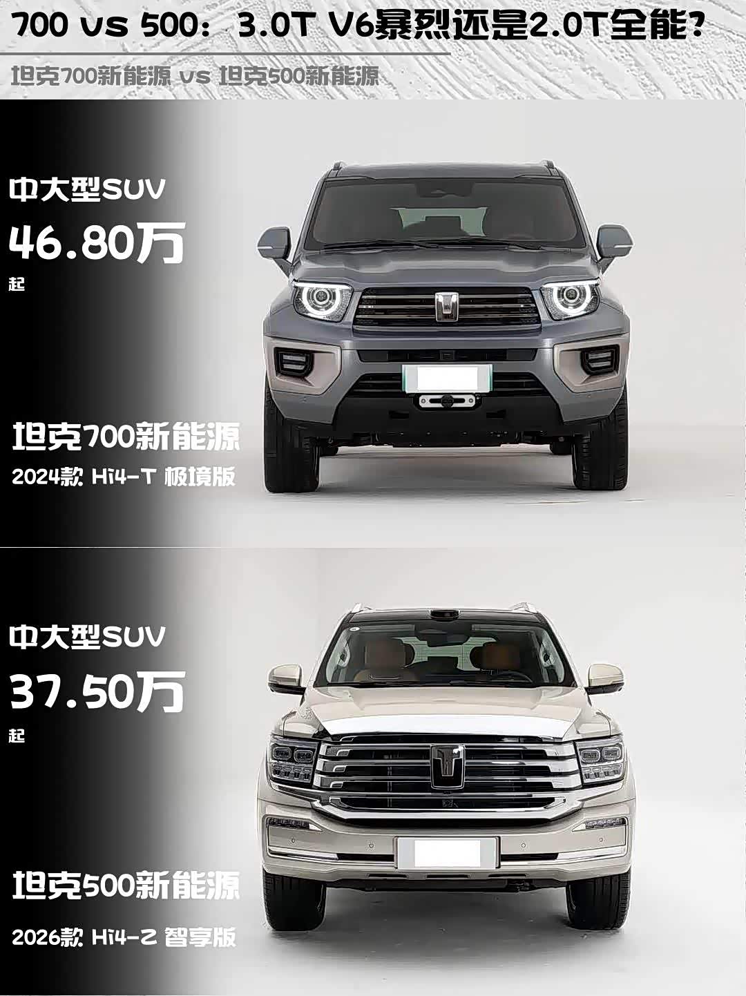 700极境版46.8万走高端路线,适合追求极致性能和旗舰体验的玩家;500智享版37.5万性价比突出,更适合既要越野又要兼顾家用的务实派。