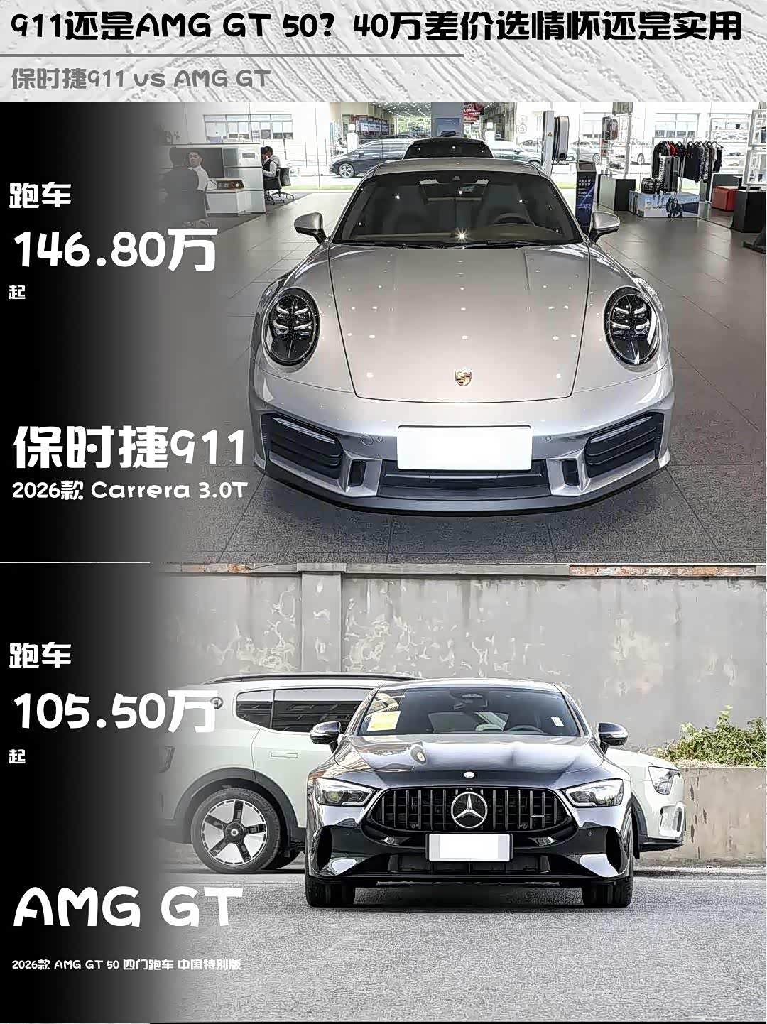 车家号·0浏览·2026-04-12 08:55 · 北京保时捷911(参数|询价) 2026款 Carrera 3.0T vs AMG GT 50四门跑车中国特别版,这两台百万级性能车到底怎么选?作为深度体验过两台车的玩家,掏心窝子分享真实感受!🔥