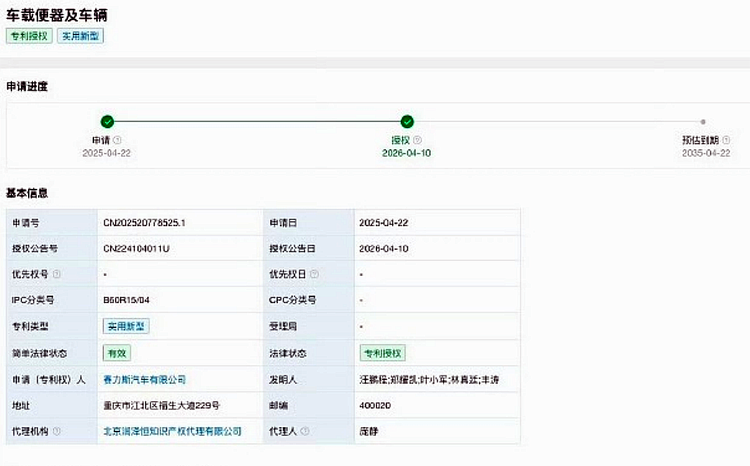 一则报道诸多提问,围绕赛力斯关于“车载便器”的话题讨论热度相当高;然而有网友怀疑这是不是真的,毕竟现在的消息真真假假很难辨识,但这就是真的,赛力斯申请的“车载便器及车辆”实用新型专利是在2025年4月22日提交的申请,在2026年4月10日获得授权。