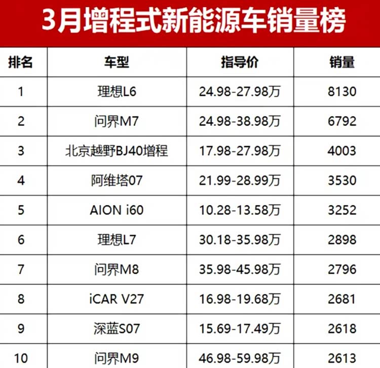 总而言之,3月的销量榜是一面镜子,照出了增程市场的集体焦虑。技术路线的光环效应减弱,市场竞争白热化,曾经的引领者面临严峻挑战。未来的出路,或许不在于死守“无焦虑”的旧叙事,而在于如何将增程的效率做到极致,或在智能化、场景化上构筑新的护城河。这场淘汰赛,才刚刚开始。
