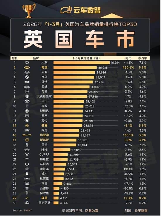 车家号·0浏览·2026-04-12 11:22 · 北京奇瑞这回在欧洲是真的杀疯了!刚拿到3月份英国市场数据,奇瑞单月干到22,495辆,直接把宝马、福特、起亚摁在地上,冲到品牌销量第2名,同比暴涨481.6%,市占率干到5.9%!一季度累计销量36,038辆,增速460%,断层式领跑。要知道在英国这种传统汽车强国,一个中国品牌能把BBA和本土老牌拉下马,含金量太高了。