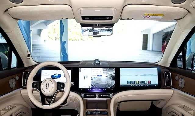 坐进车里,那股科技堆料感更强。一体化三联屏直接占据视野中心,15.6英寸中控,12.3英寸仪表,旁边还有个16英寸的娱乐屏,视觉冲击力拉满。各种智能功能,从AR HUD到车载冰箱,再到能调透光度的隐私玻璃,感觉不像在开车,像在操作一个移动工作站。