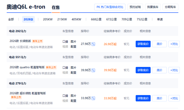 一汽 奥迪Q6L e-tron(参数|询价) 2026款三款车型定位清晰。长续航版作为入门车型,26.98万起的经销商参考价性价比突出,基础配置满足日常通勤需求;超长续航乾崑智驾版在续航与智能驾驶上全面升级,709km长续航解决里程焦虑,华为乾崑智驾系统提升驾驶便捷性,33.98万元的定价适合注重续航与智能化的家庭用户;quattro乾崑智驾版作为顶配车型,双电机四驱系统带来强劲动力,551马力零百加速仅4.5秒,标配20喇叭音响与运动外观,适合追求旗舰性能与豪华配置、预算充足的消费者。