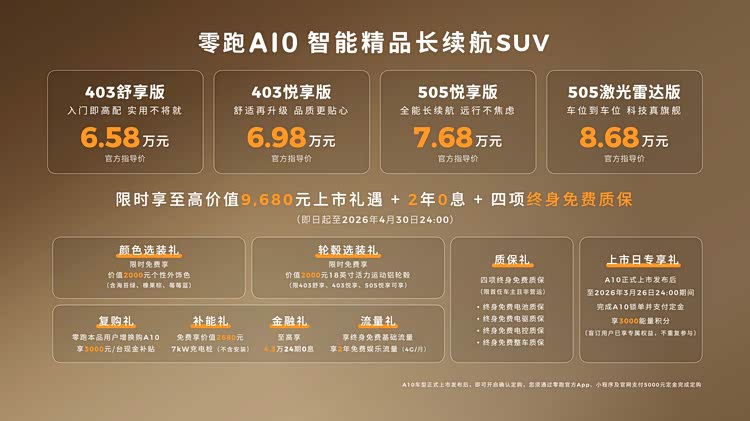在今天的主角上市之前,我觉得没有人能够想象到10万以内预算,就可以拥有一台空间内足够宽敞且配置相当丰富的SUV车型,但是零跑偏偏做到了。不久前的3月26日,零跑官方正式宣布旗下全新SUV——A10上市,此次新车共推出4款配置可选,指导价区间为6.58-8.68万元。作为一款纯电小型SUV,无论是准入门槛还是顶配价格都没什么可吐槽,尤其是新车还有诸多权益可享受,像是选装礼、金融贴息和终身质保等,让品价比得到进一步提升。那接下来咱们就再了解一下它的配置,看完或许你只会觉得零跑造车“没成本”。