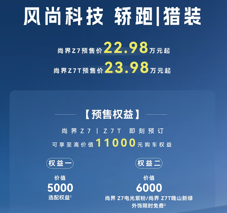先来看价格,尚界Z7家族是由尚界Z7和尚界Z7T组成,前者是标准三厢轿跑定位,后者就是类似旅行车的猎装姿态。而预售价也略有不同,如尚界Z7是22.98万起,尚界Z7T为23.98万起,预计车型配置的价格差异也会保持万元左右。不过两款车型的购车权益没区别,预订期间至高11000元购车权益可享受,说实话并不算惊喜,所以只能期望新车能将多数亮点功能标配,不然花钱选装只会让整车竞争力大大降低。