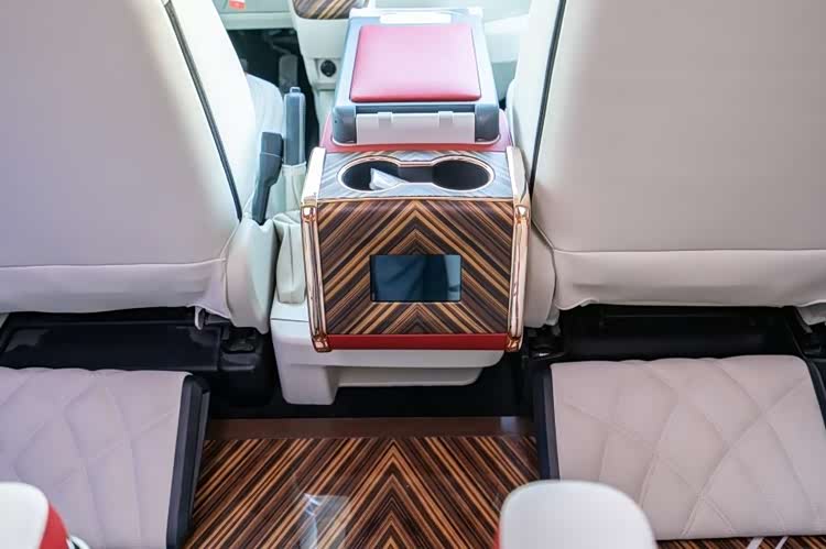 木纹色调与白红拼座椅形成 “自然 + 撞色” 的和谐搭配,金属压条沿地板边缘收边,过渡自然流畅,让座舱从 “工业感” 转向 “居家式温馨”,商务接待显格调,家庭出行添暖意。