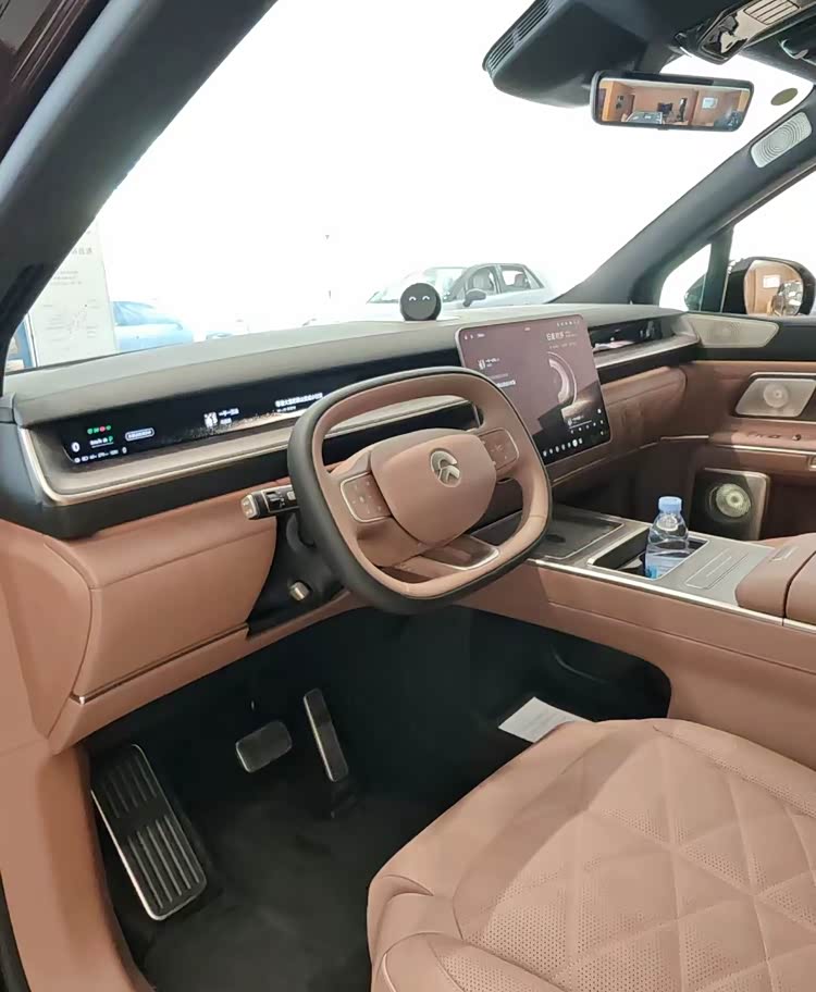 蔚来ES9的内饰营造出豪华与科技氛围,车内使用大量软性材质覆盖和皮质/真皮包裹,配备有15.6英寸AMOLED中控屏和48英寸Skyline天际屏,并提供NOMI Mate 3.0,车机内置高通骁龙8295P座舱芯片,支持语音六区域唤醒识别、手势控制、车外语音交互等,还配有1600万色主动式环境氛围灯,香氛装置、负离子发生器、车载冰箱等。