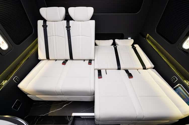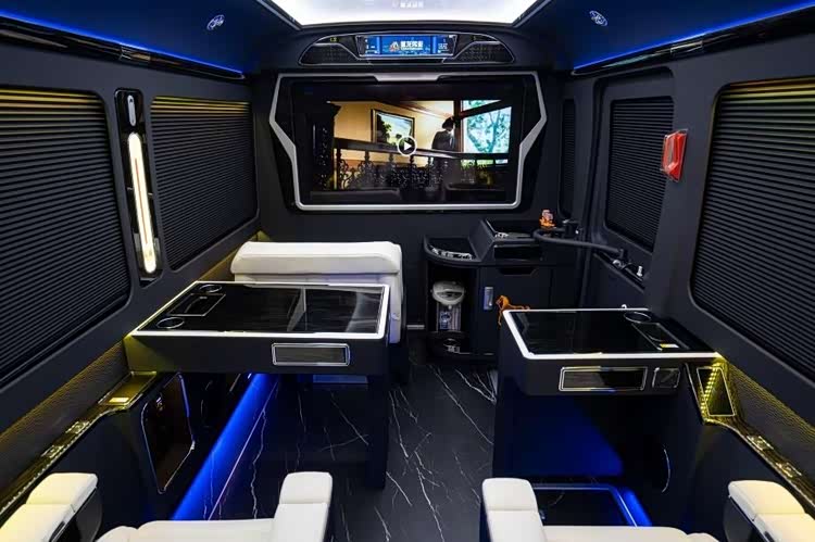 双分区独立控制沙发床太实用了,客户要是长途过来累了,随时能调成长沙发或者 beds,舒舒服服躺会儿。长条广告屏还能放公司介绍、欢迎语,细节上的用心一下就体现出来,扇形喇叭罩的音响效果也棒,放首轻音乐氛围更绝。红旗国悦4S店 北京华通丰业