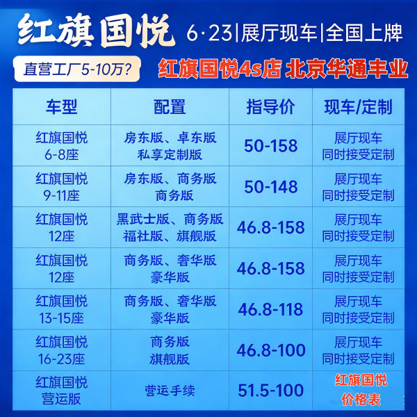 红旗国悦4S店 北京华通丰业 红旗国悦2026款落地价 【红旗国悦总部 红旗国悦4S店 北京华通丰业】6-9座房车版70万到118万,10座到12座豪华版68万到148万,13座到17座接待版45.6万到78万,18座到23座45.6万到64万,外观颜色可选山岩棕,日光金,至臻黑,天际灰,内饰支持个性化定制,红旗国悦总部提供五年十二万公里超长改装质保,全国送车上门,当天开票手续齐全,工厂直营店,购车无忧!
