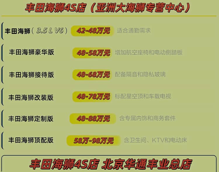 丰田海狮4S店 北京华通丰业丰田海狮8座定制版以 “全白内饰营造纯净奢感。智能配置提升商务效率” 为核心,白色座椅搭配白色地板显通透,吸顶电视 + 秘书桌控制屏兼顾娱乐与办公,完美适配 8 人企业中短途接待、客户考察等场景,让每一次出行都兼具仪式感与实用性。田海狮车长5米915,宽1米95,高2米2,搭载3.5自然吸气,六缸发动机,282匹马力!60多万起步到90多万的都有!