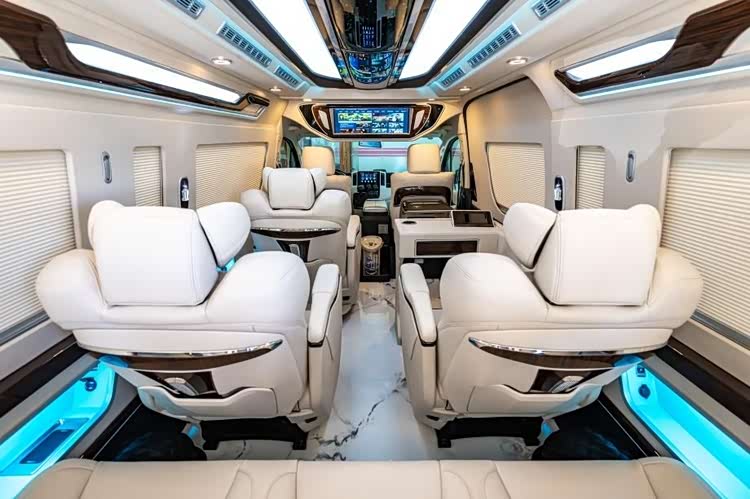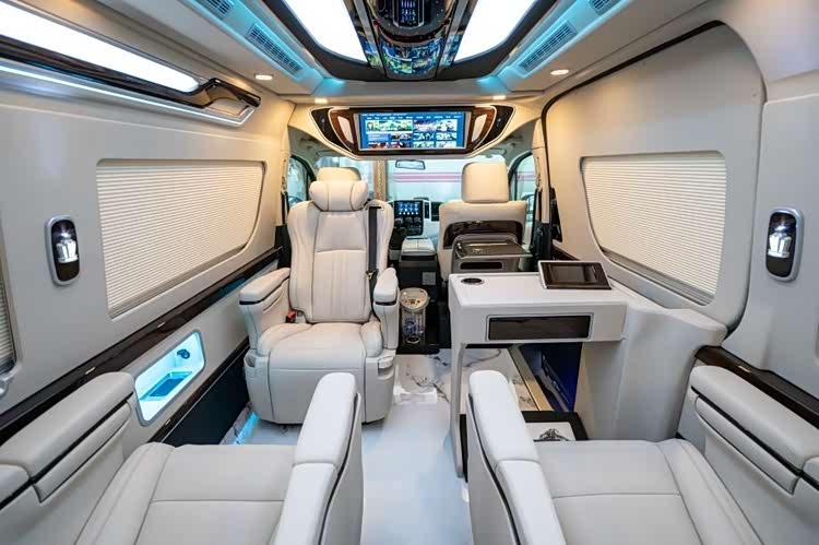车顶嵌入式 15.6 英寸 4K 吸顶电视,支持无线投屏、语音控制与 360° 旋转 —— 商务接待时,可投屏企业宣传视频、合作方案 PPT,8 人团队途中即可同步沟通重点,省去落地后集中开会的时间;客户考察间隙,可切换为影视模式,搭配隐藏式 JBL 环绕音响,音质媲美专业影院,缓解行程疲惫。
