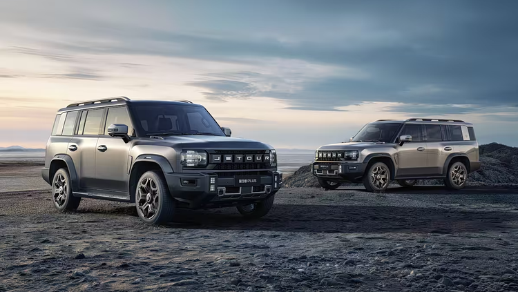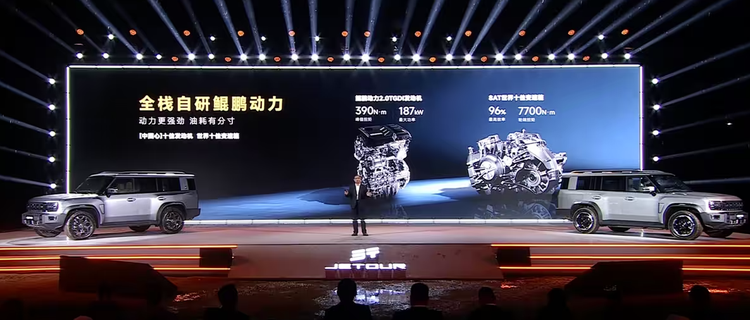 车头配备JETOUR光影格栅及矩阵式前灯,整体尺寸较大,长宽高分别为5034/2026/1880毫米,轴距2800毫米,全系标配20英寸哑光轮圈。接近角28°、离去角23°,最小离地间隙220毫米(C-DM车型为205毫米),涉水深度700毫米。车尾采用经典的“小书包”外挂备胎设计,配备魔术电吸尾门和直瀑贯穿式尾灯。