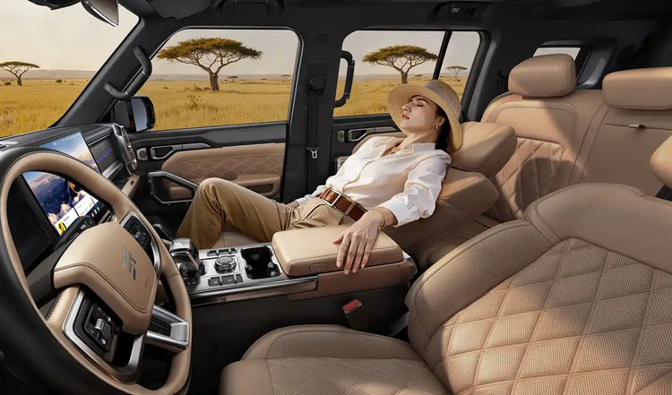 内饰方面,新车延续了旅行者硬派前卫的风格,保留了部分实体按键。配备内嵌式全液晶仪表盘、三辐式双色多功能方向盘以及15.6英寸2.5K超清中控触摸屏,搭载高通8155芯片,内置TOUR OS 3.0智能座舱,支持科大讯飞星火AI语音大模型。新车还配备APA全自动泊车、全景影像及疲劳监测系统,并提供华为乾崑辅助驾驶版本。座椅采用高级菱形缝线设计,10层舒适结构,前排座椅支持加热、通风,主驾提供8点按摩,副驾配备一键女王座,二排座椅带加热功能及小桌板。