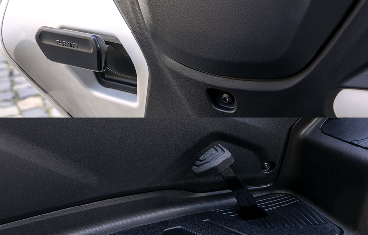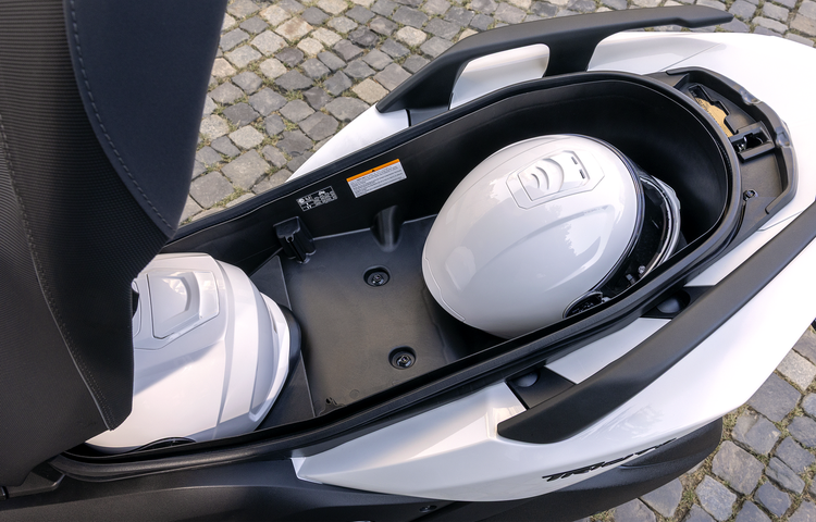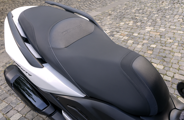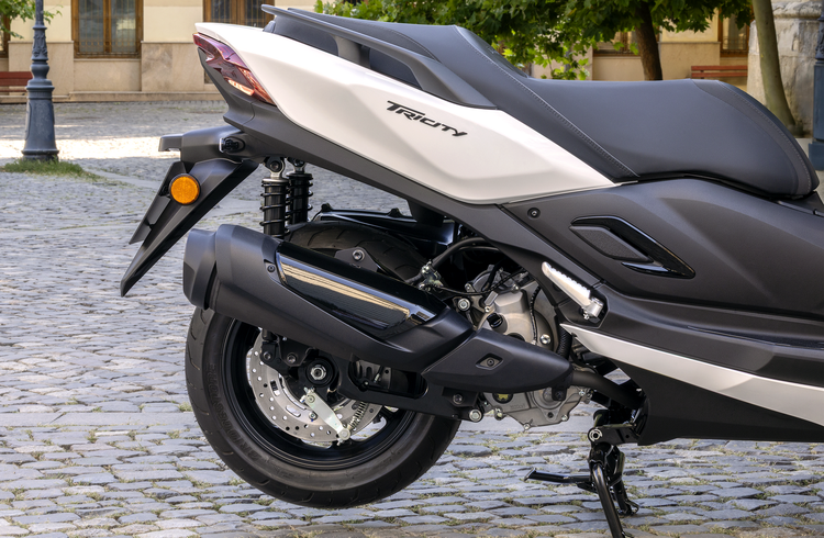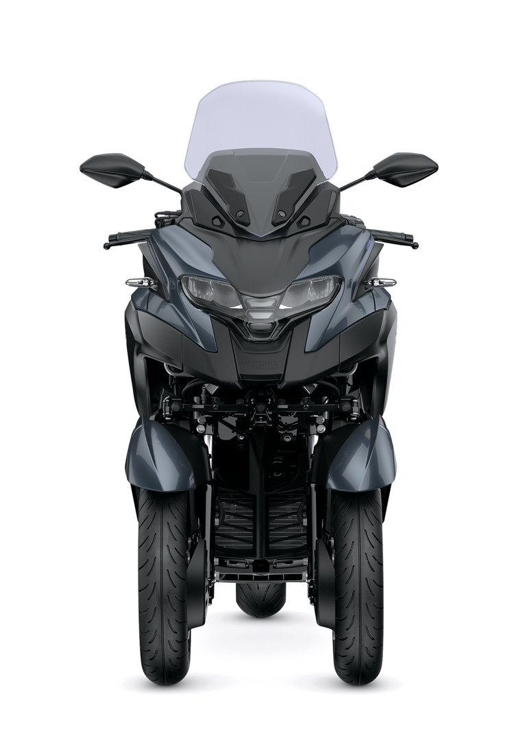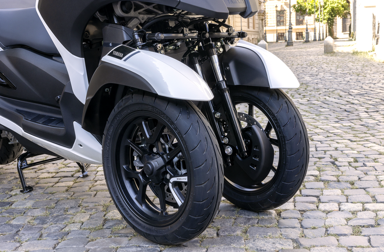车身方面,它采用前置两轮、后置一轮的倒三轮布局,配备钢制主梁带加强肋车架,标志性的LMW可倾侧前轮系统,搭配平行四边形连杆和摇臂式前悬挂,每侧双正立式前叉管隐藏在前轮内侧,行驶时抓地力更强,不管是光滑路面还是崎岖路段,都能保持稳定灵活的操控。制动上采用双前碟、后单碟设计,搭配弯道ABS+UBS联动刹车系统,进一步提升骑行安全性。