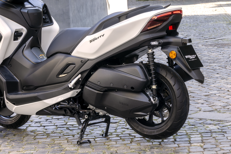 2026款雅马哈LMW300动力部分沿用了与雅马哈XMAX300同平台的动力总成,搭载一台水冷四冲程单气缸、SOHC四气阀的蓝芯发动机,实际排气量292cc,缸径和行程分别为70mm×75.9mm,最大功率可达20.6kW/7250rpm,峰值扭矩28.9N.m/5750rpm,动力输出平稳,完全能满足城市通勤和短途出游的需求。为了符合欧五+排放标准,新车换装了新的消声器,优化了催化器布局和ECU参数,整车重量也减轻了800克,兼顾环保与轻量化。