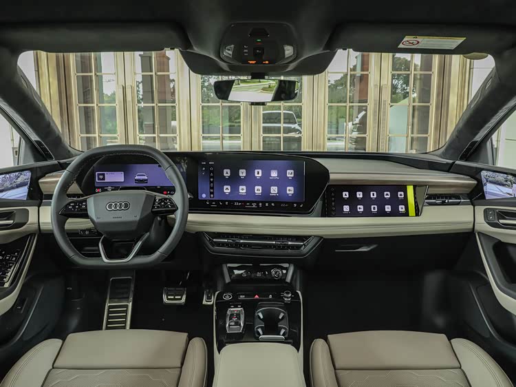 车内由11.9英寸虚拟座舱、14.5英寸MMI中控屏、10.9英寸副驾娱乐屏、AR-HUD抬头显示以及电子外后视镜双屏组成六屏联动系统。副驾屏支持隐私模式,AR-HUD可显示速度、交通标识、导航等信息。中控屏内置Avatar情感化语音形象,支持“可见即可说”,60秒内可连续识别10条指令。