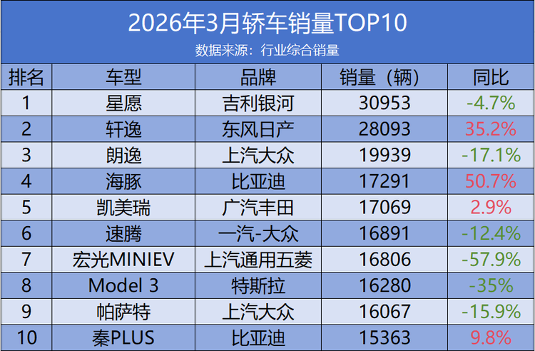 合资品牌阵营整体承压,仅两款车型实现正增长。广汽丰田凯美瑞以17069辆的销量位列第五,同比微增2.9%,在中型燃油轿车市场保持稳定;而德系品牌则全线下滑,一汽-大众速腾、上汽大众帕萨特分别同比下滑12.4%和15.9%,排名第六和第九,传统燃油中型车和紧凑型车的市场空间正在被新能源车型不断挤压。