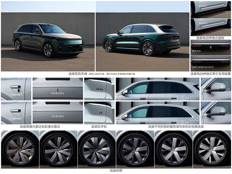新车全系可选装侧向和后向固态激光雷达,结合前向双激光雷达,顶配版本最多可搭载四颗激光雷达。此外还可选装电动伸缩踏板、电动伸缩拖车钩(准拖挂总质量1500kg)、双色车身及21/22英寸轮毂。