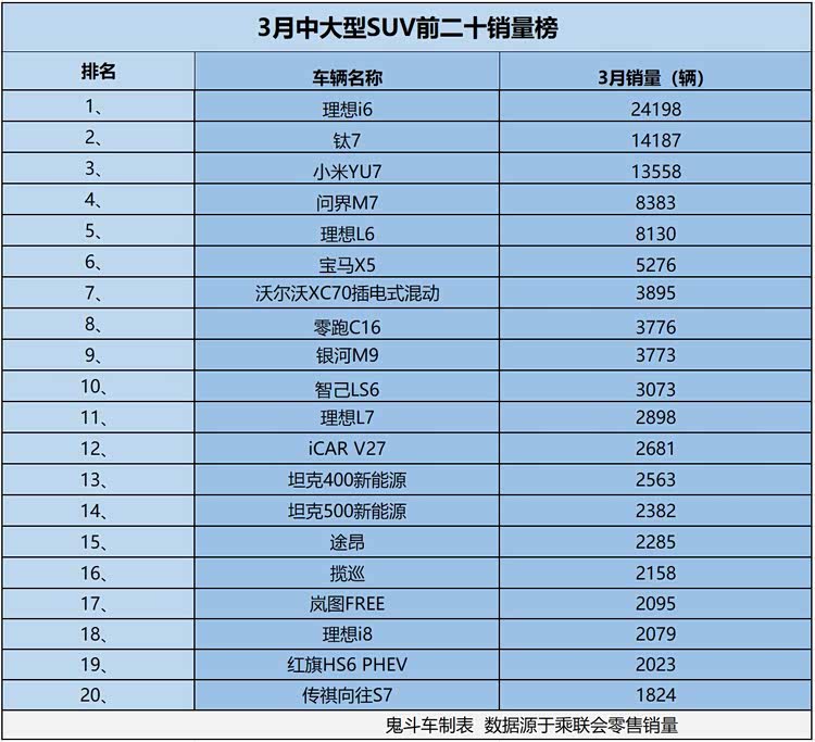 此外,进入前二十销量榜单的车型还有途昂、揽巡、岚图FREE、理想i8、红旗HS6 PHEV、传祺向往S7,这几款中大型SUV在3月零售销量都超过1800辆,市场表现都不错。
